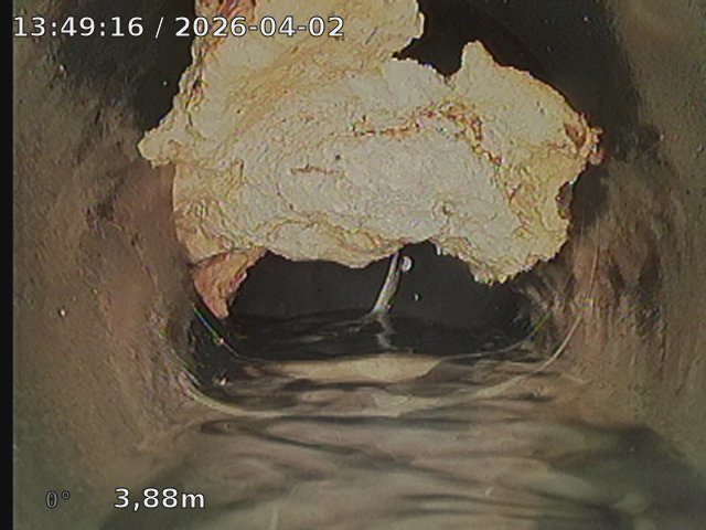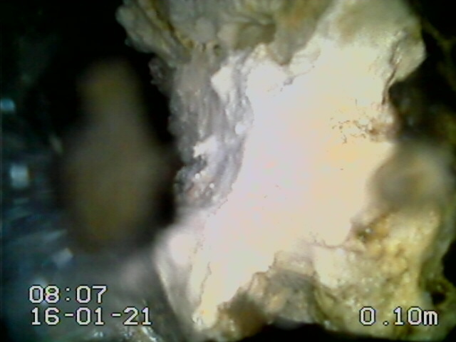 深夜・緊急作業の為、あまり画像は御座いませんが、配管の中にモルタル付着を確認しました。管内カメラの画像を頼りに、特殊除去作業となりました。詰まりを清掃後に確認するとモルタルでの完全閉塞では御座いませんでしたので、予定通り全て短時間で除去出来ました。
