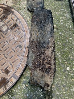 完全に土管が破損している現場でしたが応急で詰まり抜き作業を行いました。大きな油脂の塊に破損した土管が刺さっています。塩ビ製の配管に替える等修繕作業が必要です。