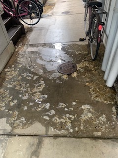 年中通して依頼の多い、雨水管の詰まり・清掃作業。この現場は雨が降る度に溢れていました。土管でヒビだらけでしたが、可能な限りの清掃を行いました。屋上の排水口の詰まりでプール状態になっているビルもありますが、排水管同様、点検・清掃が必要ですね。