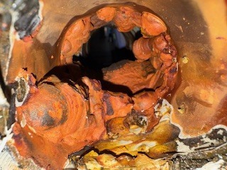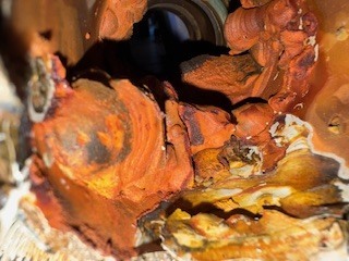 今後担当させて頂く現場の下見と管内調査を行いました。鉄錆による錆瘤・油脂等、色々と情報がわかりました。大型の施設で調査中に排水は止めれずのままでの調査でしたが、調査結果を元に実際の作業の工法等を決定致します。その他の配管も酷い閉塞状態でした。